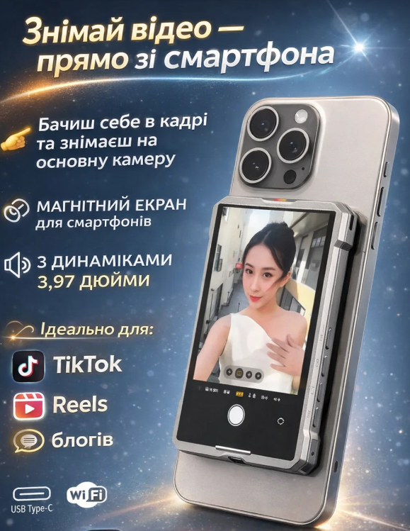 Тепер не потрібно гадати, чи ти в кадрі 🤔Магнітний екран показує все в реальному часі — просто прикріпи до смартфона і контролюй кожен момент 👀